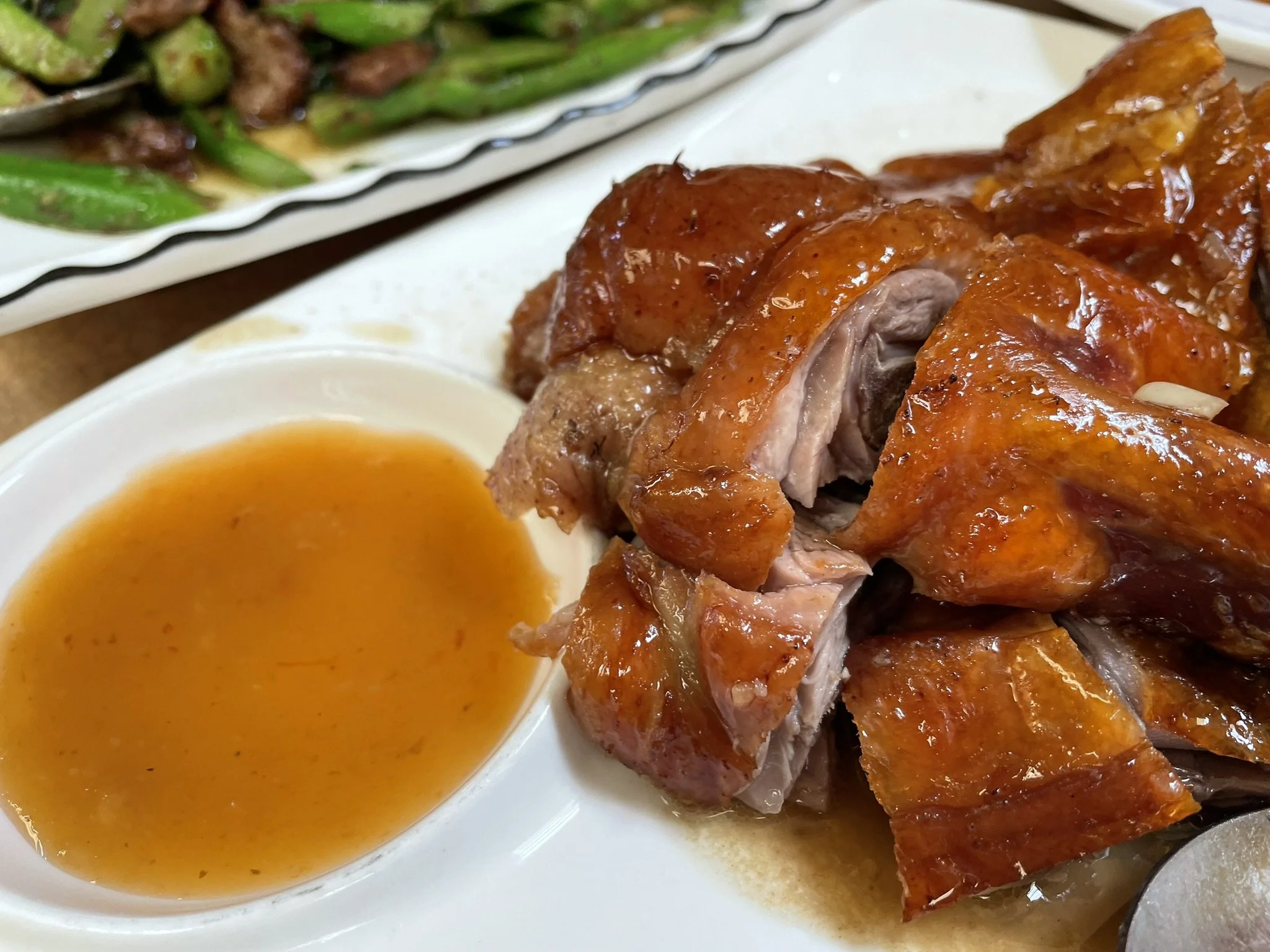 photos below show the crispy duck, gai lan with beef and cold spicy beef tendon appetizer.